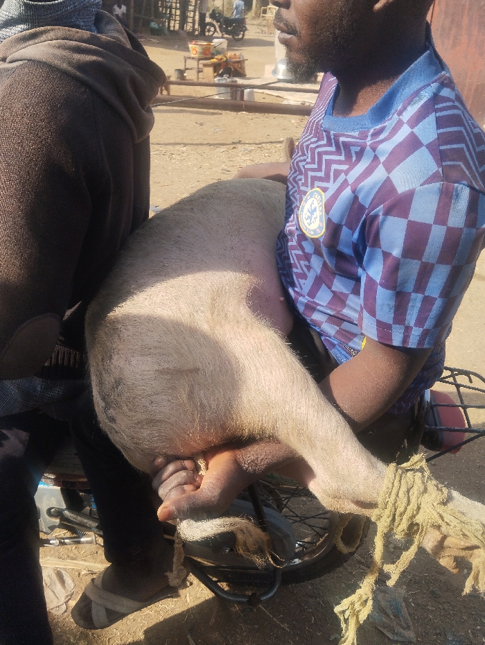 - "In Unguwan Rimi, Nigeria, an outdoor scene depicts two individuals transporting a live, light-colored pig" by FM-eRG922, licensed under CC BY 4.0