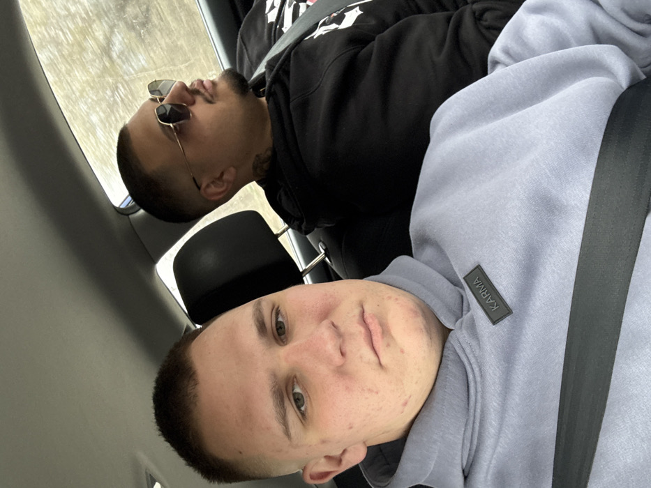 The scene depicts two adult males seated inside a vehicle, purportedly within or traveling through the city of Vetren, Bulgaria. The subject in the foreground, positioned on the left, is a light-skinned male with a short buzz cut hairstyle and green eyes. He exhibits visible acne on his cheeks and jawline. He is wearing a light grey or periwinkle blue hooded sweatshirt featuring a black rectangular patch on the upper chest with the word "KARMA" in white capital letters. A black seatbelt is diagonally across his torso. His gaze is directed forward, seemingly towards the camera, with a neutral expression. Behind and to the right of the foreground subject, the second male subject is visible. He possesses a darker skin tone, short dark hair with a fade, and a trimmed mustache and beard. He is wearing dark sunglasses with light gold-colored, hexagonal-framed lenses. A dark tattoo is partially visible on the right side of his neck. He wears a black hooded sweatshirt and a black seatbelt across his chest. His head is turned slightly to the right, and his gaze is directed away from the camera, looking towards the vehicle's right side or ahead. The interior of the vehicle shows a light-colored headliner and a black headrest behind the foreground subject. Through the windows in the upper right quadrant of the image, a blurred outdoor background consistent with light green and brownish foliage or trees suggests the vehicle is in motion or parked outdoors.