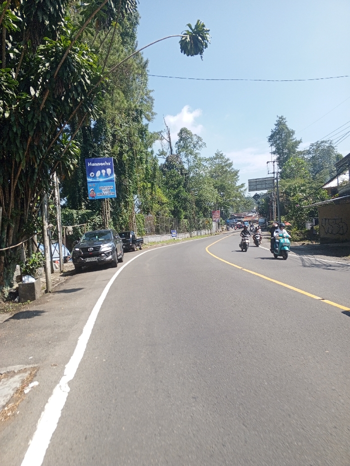 This image depicts an outdoor road scene in Multhan, India, observed during clear daylight conditions. The scene features an asphalt road that curves to the right, bordered on the left by a solid white line marking the shoulder and a double yellow line visible further into the curve. On the left side of the road, a dark-colored Toyota Fortuner SUV, bearing license plate F 1555 ACV, is parked on the shoulder. Behind it, a dark-colored pickup truck is also parked. Directly above these vehicles, a blue rectangular billboard is mounted on a pole, displaying the brand "Hannocho" alongside images of light bulbs and text in Indonesian, "SEDIAKAN TERJAGA KUALITAS". The immediate left edge of the road is densely vegetated with tall trees, including pines, and a streetlamp structure with a distinctive, large drooping element. The right side of the road features utility poles and lines, along with several buildings, one of which exhibits graffiti on its exterior wall. In the mid-ground, a group of five motorcycles and scooters is actively traveling along the curved road, moving away from the viewer. The lead vehicle is a light blue Vespa-style scooter, followed by four darker-colored motorcycles. Multiple individuals are operating these motorcycles. The background shows distant hills or mountains beneath a blue sky with minimal cloud cover.