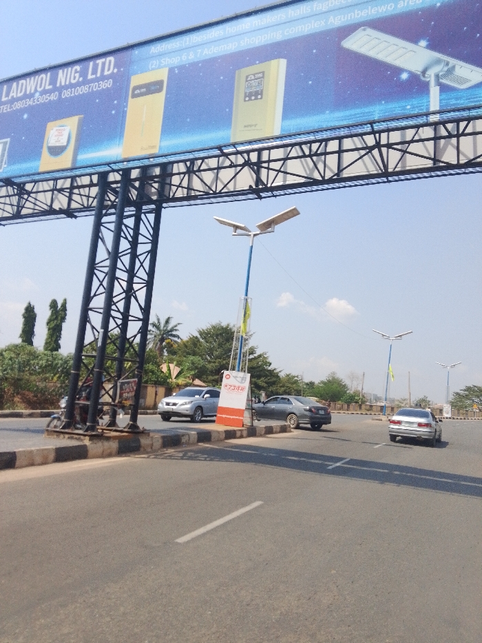 This daytime image depicts a multi-lane asphalt road in the Agunbelewo area of Oshogbo, Nigeria, viewed from ground level looking down the thoroughfare. A large overhead billboard, supported by black steel-truss structures on either side of the road, dominates the upper frame. The billboard advertises "LADWOL NIG. LTD." and displays various solar power products, including inverters and an outdoor solar street light fixture. One address listed is "Ademap shopping complex Agunbelewo area." The road features a median with black and white striped curbs, separating traffic lanes. A white dashed line is visible on the asphalt in the foreground. Several blue and white pole-mounted streetlights with two horizontal LED fixtures are positioned along the median, with an orange and white "OPPO" branded sign attached to the closest pole. Traffic includes a silver sedan and a dark grey sedan on the left side of the road, and another silver sedan traveling away in the far right lane. A motorcycle is parked or positioned near the base of the left billboard support structure. Lush green trees and shrubs are visible in the background, lining the sides of the road. The sky is clear and bright blue. No people are discernible in the scene.