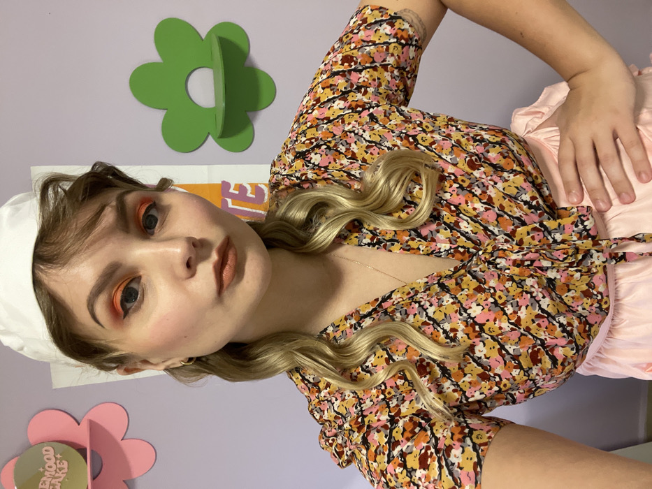 The scene depicts a female individual in a brightly lit indoor setting, presumably within Tel Aviv, Israel. The woman has fair skin, blonde hair styled in waves with bangs across her forehead, and is looking directly at the camera. She wears a white cap and has prominent orange eyeshadow, black winged eyeliner, and warm brown lipstick. Her attire includes a short-sleeved, v-neck wrap blouse with a tie-front, featuring a dense abstract floral pattern in colors such as yellow, pink, orange, black, and maroon. A light pink, possibly ruffled, garment is visible below her blouse. She wears a small gold hoop earring in her left ear and a delicate gold chain necklace. Her left hand is placed on her hip. The background consists of a light lavender wall adorned with two flower-shaped wall shelves: a pink one on the left displaying a circular item with "LEMOOD CAKE +" text, and a green one on the right that is empty. A colorful poster with partially visible large letters is also present on the right side of the background.