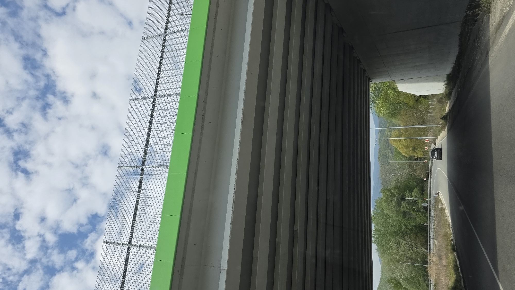 The image depicts a view from under a concrete overpass, alongside a noise barrier, likely in the city of Slivnitsa, Bulgaria. The sky visible on the left shows a partly cloudy day. The noise barrier features a green vertical stripe and a gray wire mesh. The overpass structure consists of concrete pillars. Through the opening under the overpass, a road curves, with a car driving on it. Vegetation, likely trees and bushes, lines the road. Beyond the vegetation are mountains in the distance. The image suggests a location near a highway or major road in a somewhat rural area outside Slivnitsa.