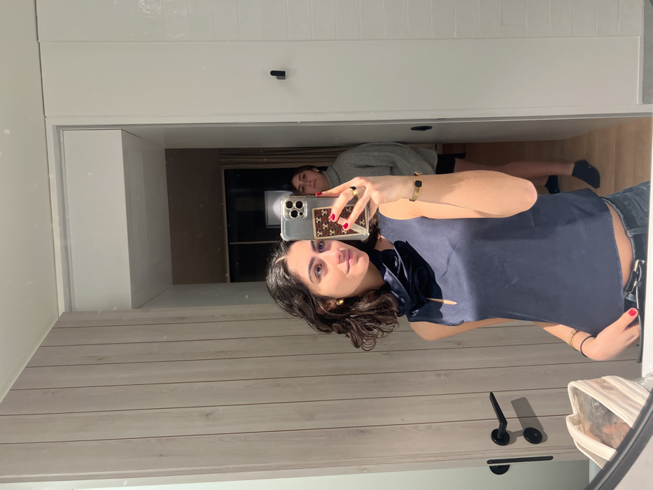 A woman takes a mirror selfie in a room with light-colored wood paneled walls and white trim. She wears a dark blue top, jeans, a gold bracelet, and a ring. Her phone has a patterned case. Reflected behind her, another person lies on the floor wearing a gray sweater and black socks. The background shows a window and possibly construction or remodeling. A white vanity bag rests on the counter near the edge of the mirror.