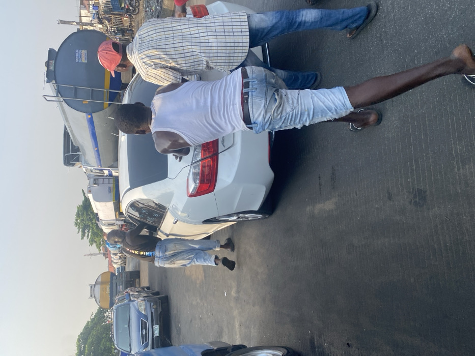 A white car is surrounded by three people. Two men stand at the back of the car. One wears a white tank top and light jeans, while the other has on a checkered shirt and a red hat. A third person in a black shirt stands slightly away from the back, near the rear passenger door of the car. A blue vehicle is near the bottom of the frame. Tanker trucks are parked behind the car, lining the roadside.