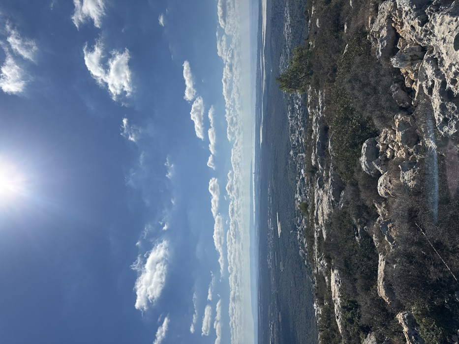 This panoramic daytime image captures a vast landscape under a bright, partly cloudy blue sky with the sun prominently visible in the upper right, causing lens flare. The immediate foreground is dominated by light-colored, exposed rock formations interspersed with sparse, dry, low-lying green and brown bushes. A single, distinct green tree is visible on the right side of the midground, near the transition from rocky terrain to forest. The midground features a dense, dark green forest covering extensive hilly areas, beneath which a small town or village with numerous buildings and roads is discernible. In the distant background, a broad coastal plain extends towards a large body of water, identifiable as the Mediterranean Sea, with a faint city skyline visible along the distant horizon. The scene is devoid of people or direct human activity. This vantage point is located within the Mate Asher Regional Council, Israel, offering a wide view of the coastal region.