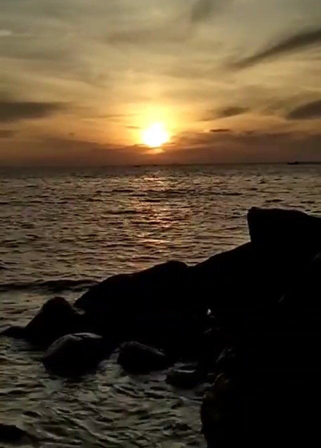 sunset over the ocean. The sun is a bright orb just above the horizon, casting an orange glow across the sky and reflecting on the water. There are dark, jagged rocks in the foreground, their silhouettes contrasting with the bright light. The sea is gently rippling, and there are a few small boats visible in the distance.