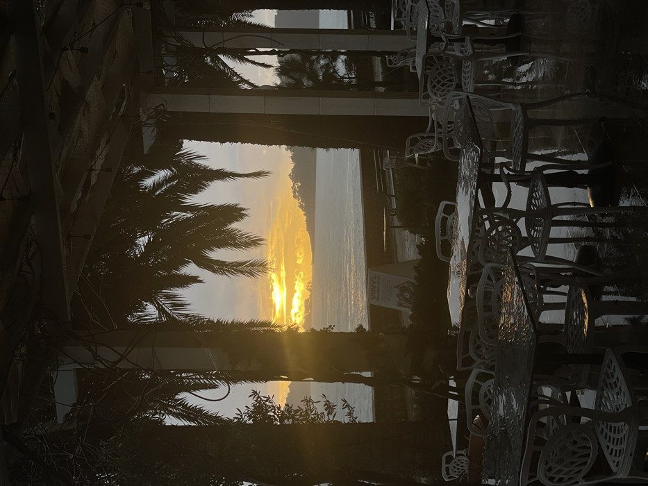 sunset viewed from a partially covered outdoor seating area. Palm tree silhouettes frame a vibrant yellow and orange sunset over the ocean. Light reflects off the tables and chairs, which are arranged in rows. The perspective is slightly skewed, emphasizing the sky.