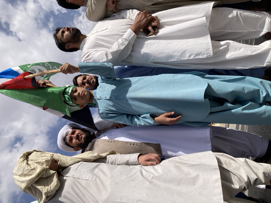 This image captures a group of six males, including one boy, participating in an outdoor gathering in Quetta City Tehsil, Pakistan. The sky overhead is partially cloudy. In the central foreground, a boy, estimated to be between 8 and 12 years old, stands wearing a light blue shalwar kameez and a green headband inscribed with white Arabic script. He holds two flags aloft on wooden poles with his raised right hand. The flag on the viewer's left is predominantly green with white Arabic script, resembling the Saudi Arabian flag. The flag on the viewer's right is a Palestinian flag, characterized by horizontal stripes of black, white, and green, with a red triangle positioned at the hoist. To the boy's immediate left, an adult male is partially visible, dressed in an off-white shalwar kameez with a light-colored fabric draped over his head, obscuring his face. Behind and slightly left of the boy, an adult male with a beard wears a white shalwar kameez, a white turban, and a light brown vest; he is looking upwards and to the right. Behind and slightly right of the boy, another adult male with dark hair and a beard, wearing a dark blue shalwar kameez, looks forward or slightly upwards. To the boy's right, an adult male with a beard is dressed in a white shalwar kameez; he holds a dark object, possibly a mobile phone, clasped in his hands and is looking upwards and to the right. A sixth male, partially visible on the far right, wears beige attire. All individuals are dressed in traditional Pakistani garments.