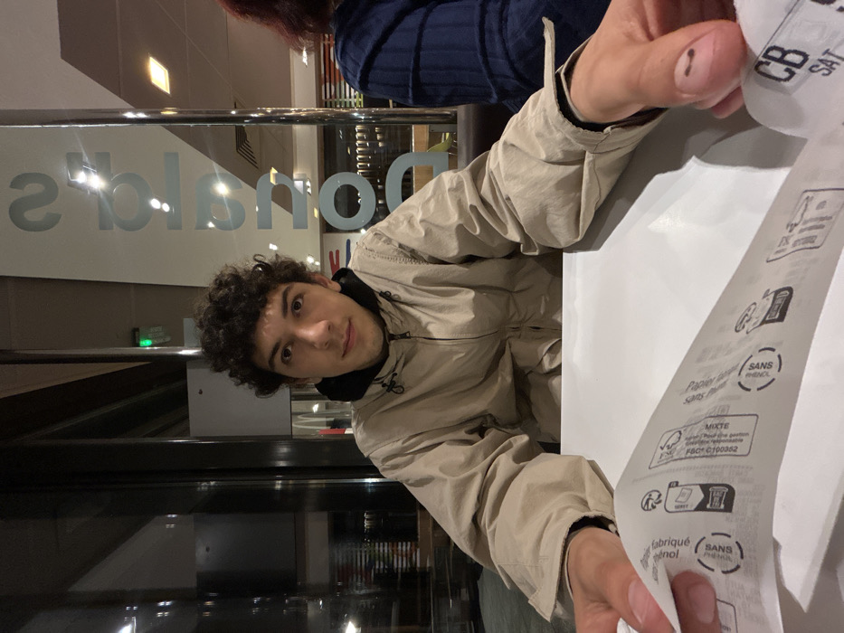 The image depicts an indoor scene at a McDonald's restaurant located at Centre Commercial Nord, 2 Rue de l'Industrie, 67460 Souffelweyersheim, France. A male individual, approximately 20-30 years old, with dark curly hair and a light complexion, is centrally positioned, looking directly at the camera. He is wearing a light beige or khaki hooded jacket over a dark garment. His hands rest on a white table, holding a piece of white paper that displays text and graphic icons, including French words such as "SANS" and "MIXTE," and a "CB" (Carte Bancaire) logo on a label or roll. A second individual is partially visible on the right side of the frame, showing a shoulder and arm in a dark blue ribbed top, along with a portion of their red-brown hair. The background features reflections on a glass or mirrored surface, revealing the reversed word "Donald's" (part of "McDonald's") and indistinct interior elements, including a green light fixture on the upper left. The lighting is artificial, characteristic of an indoor commercial setting.