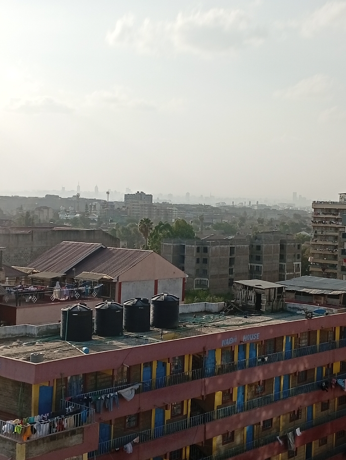The cityscape is viewed from above, with buildings stretching into the hazy distance. In the foreground, a multi-story building with a pink and yellow facade is visible, adorned with hanging laundry and the words "NABI HOUSE." Above it, black water tanks sit on a flat rooftop adjacent to a smaller building with a brown tiled roof. Beyond, more buildings rise, gradually fading into the misty horizon where taller structures can be faintly discerned.
