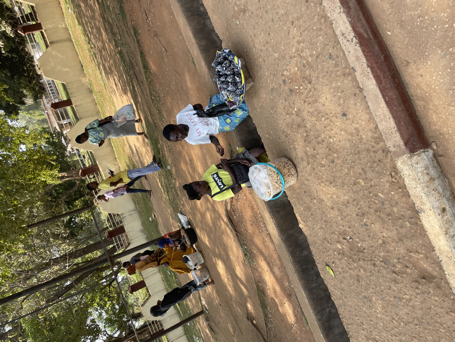 The image depicts an outdoor market scene in Markurdi, Nigeria, under daylight conditions. A concrete gutter runs horizontally across the immediate foreground. On the concrete edge, a clear plastic bucket filled with light-colored, elongated snacks is positioned. Two young females are seated on the ground next to the gutter. The female on the right, wearing a white t-shirt with "MY LOVE IS PURE" text and a patterned blue skirt, holds a black plastic bag and extends her right hand as if offering an item. Beside her, a yellow tray contains numerous dark, round objects. The female on the left, wearing a yellow "Levi's" t-shirt and a dark skirt, faces the vendor and appears to be engaging in a transaction. A small white bucket with a handle is near her. Further into the mid-ground on the left, another vendor, dressed in a yellow garment, is seated on the dirt ground. She is surrounded by various containers, including a large metal bowl of dark, round objects and a clear plastic bucket of light-colored snacks. Several individuals stand nearby; one in a dark top and patterned skirt faces away from the viewer. In the background, a light-colored wall with brown-capped pillars encloses a property. Trees with green foliage are visible behind the wall and in various parts of the scene. A woman in a light blue floral top and grey skirt walks towards the right, holding a white bag and observing her mobile phone. Behind her, two men are present; one in a yellow t-shirt and jeans looks left, while another in a lighter shirt is partially obscured. The ground throughout the scene is composed of packed dirt with sparse patches of grass.