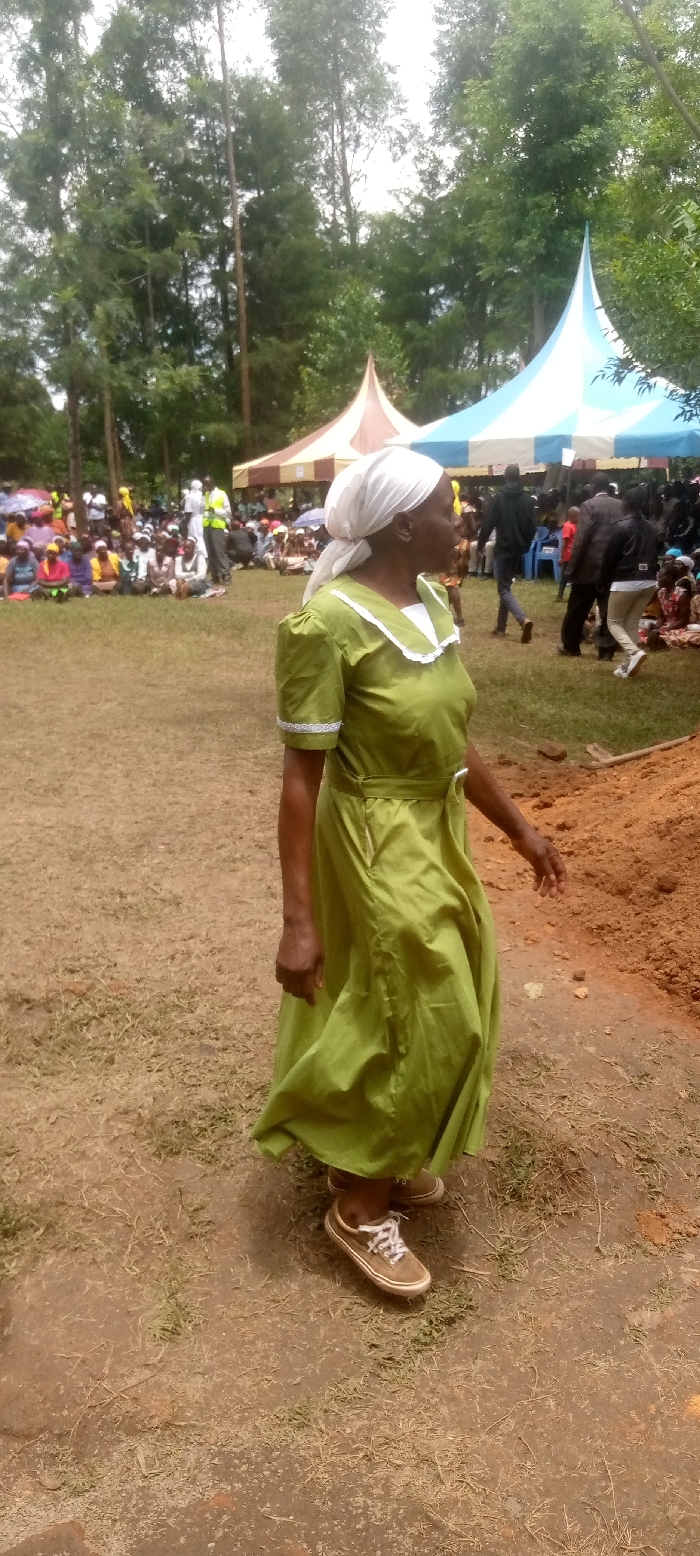 woman wearing a green dress and white head covering, standing in a grassy area near a pile of dirt. The location is in Burundu, Kenya, at the coordinates (latitude: 0.46, longitude: 34.776). The woman is facing the right side of the frame, with her head slightly tilted down. She is standing on the edge of a dirt path, her right foot is slightly raised from the ground. Her left hand is hanging by her side while her right hand is gesturing to the right. Her shoes are brown and lace-up, and her dress is green with white lace trimming the neckline and the sleeves. Behind her, there are two large tents with a large crowd of people sitting and standing under the shade of a large group of trees. The scene is outdoors and there are some trees in the background. The grass is mostly brown and there are some patches of green. The weather appears to be sunny. There is a pile of dirt and the ground is mostly dry and dusty.