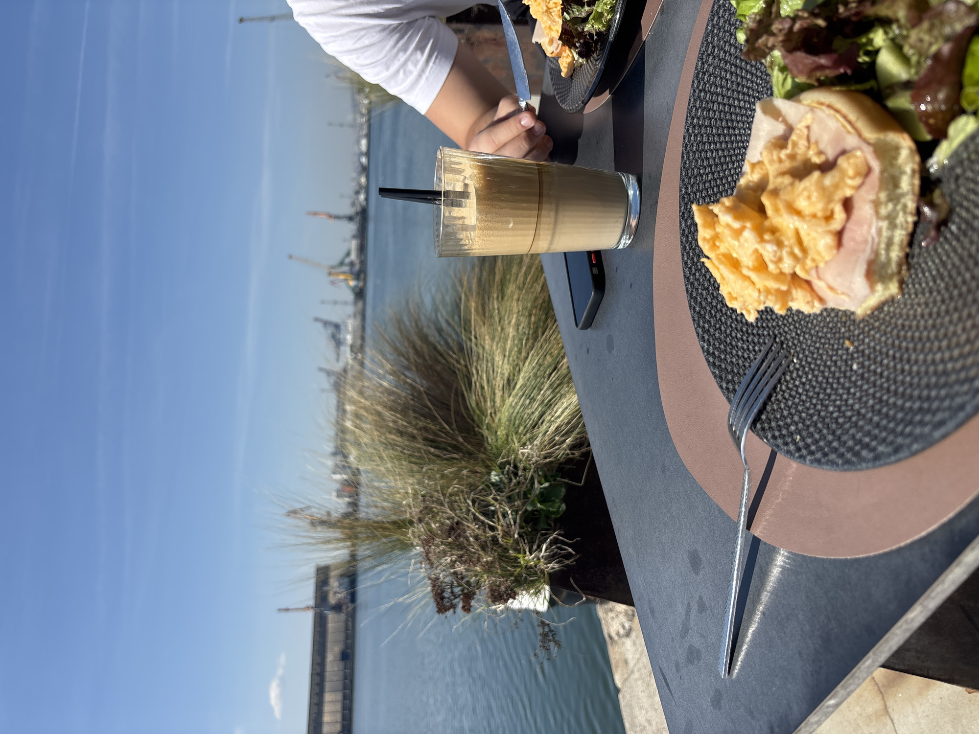 table setting at an outdoor restaurant in Burgas, Bulgaria, overlooking the harbor. A person in a white shirt is seated at the table, with a coffee drink and two plates of food visible. One plate has a sandwich topped with scrambled eggs and a side salad, and the other plate contains what appears to be fried food. Cutlery is present, including a knife and fork. A mobile phone is placed on the table. A potted plant acts as a natural divider. The harbor is in the background with cranes and port infrastructure visible. The sky is clear and blue.