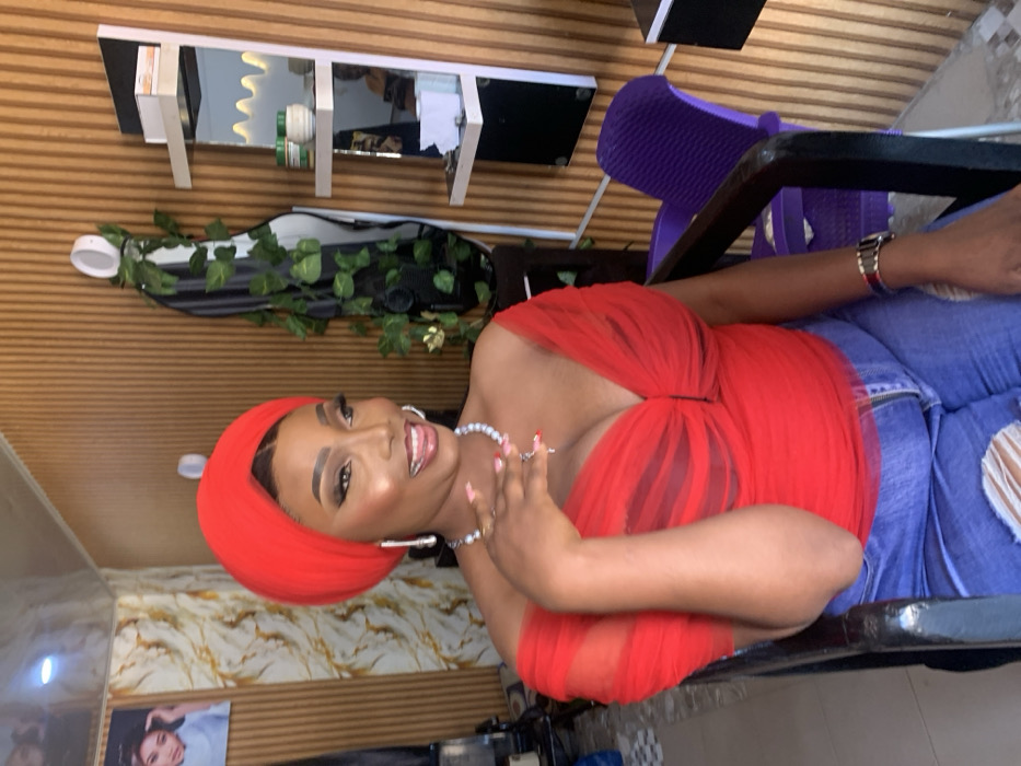 An adult female is seated in an indoor setting, likely a beauty salon or studio