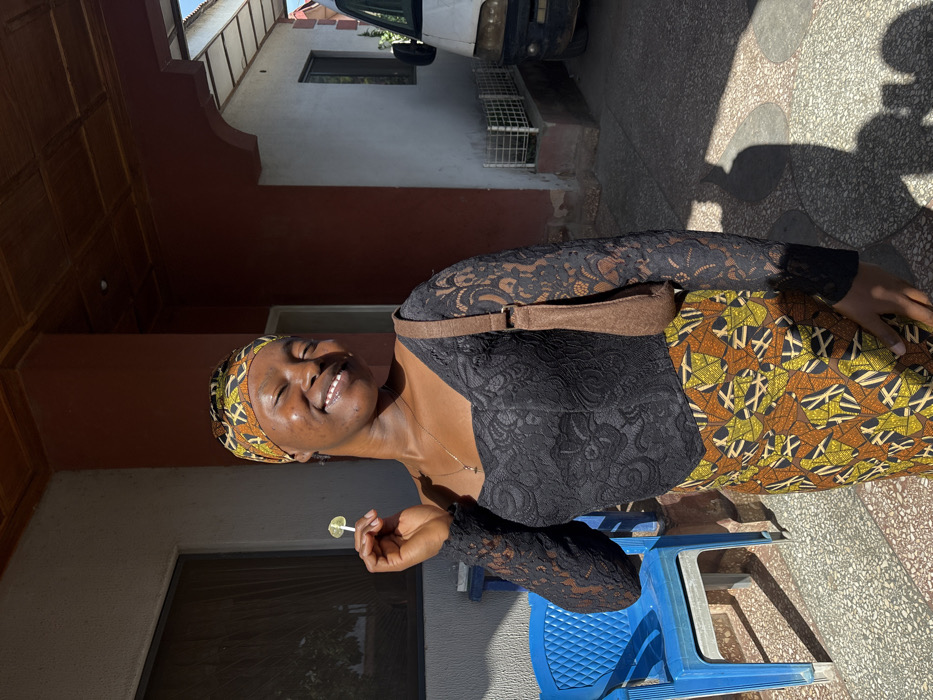 A smiling woman with a patterned headscarf, black lace top, and brown patterned skirt holds a lollipop. She sits on a blue plastic chair outside. The background shows a building with red trim and a white exterior. A vehicle is partially visible, and dappled sunlight patterns the ground. The scene is bathed in bright natural light.