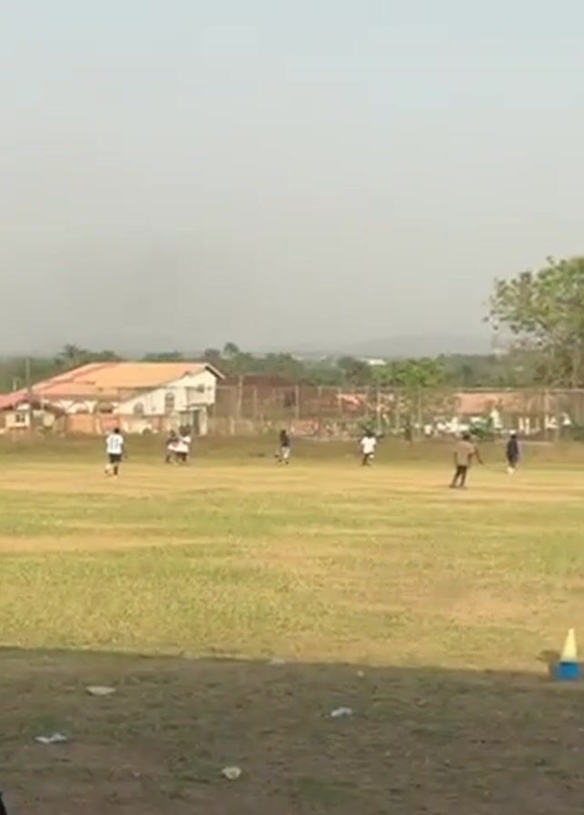 The video depicts a group of people playing soccer on a grassy field. The players are wearing varying athletic attire, including light-colored and dark-colored jerseys. A soccer ball is visible in motion between the players. In the foreground, there are two individuals standing near a blue cone, seemingly observing the game. The background features buildings, trees, and a distant mountain range under a hazy sky.
