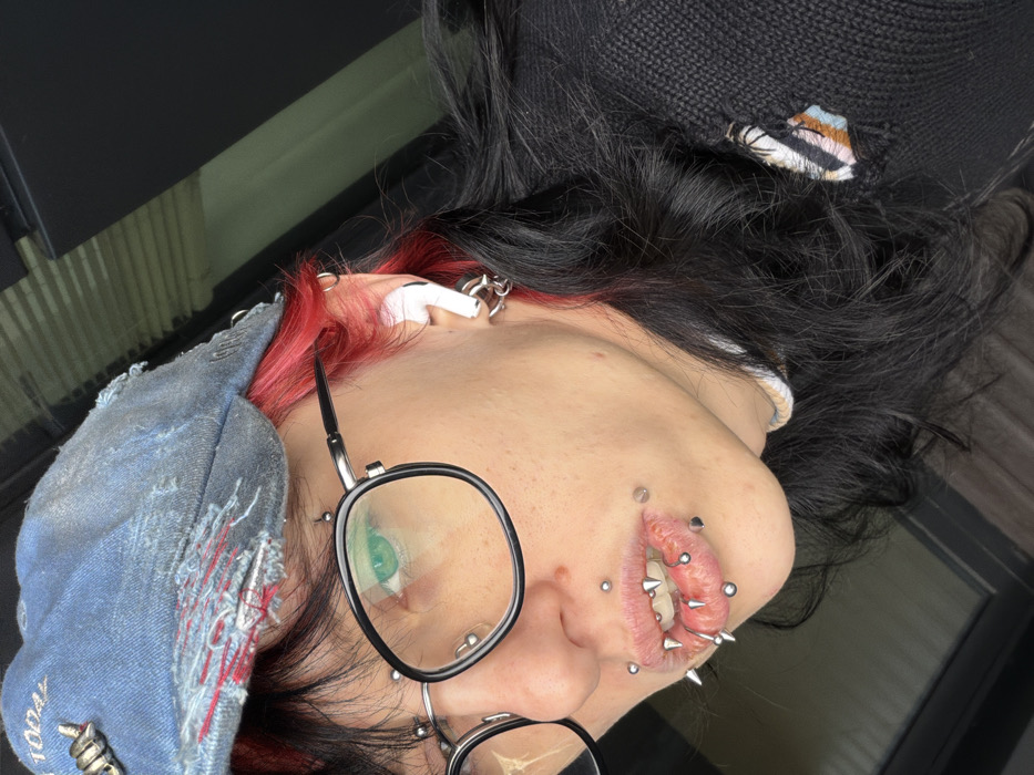 The image presents a close-up portrait of an individual in Sofia, Bulgaria, although the specific location within the city is not visually identifiable from the frame. The subject has fair skin and looks directly at the camera. They wear a distressed, light-blue denim baseball cap, featuring torn fabric, red stitching, and a silver-colored barbed wire embellishment on the front left. Visible beneath the cap is long, dark hair with prominent red highlights. The subject wears black-rimmed glasses, through which their green right eye and an eyebrow piercing are visible. Numerous facial piercings include a septum piercing, a stud-type piercing on the right cheek, and multiple silver-colored studs and spiked rings adorning both the upper and lower lips. A white wireless earbud is present in the right ear, accompanied by several silver-colored hoop and ring earrings, some appearing linked. The subject is dressed in a dark, possibly black, knitted outer garment, with a lighter-colored, potentially striped, garment visible beneath at the neckline and a partially torn cuff. The background is dark and out of focus, showing indistinct architectural or structural elements.