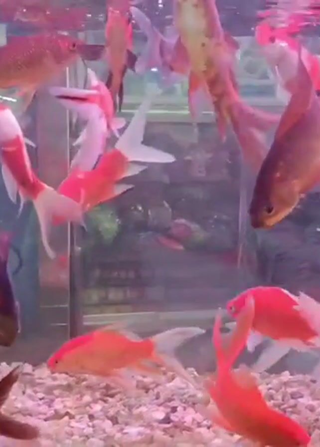 rectangular fish tank filled with gravel and a large number of fish, mostly red and white goldfish