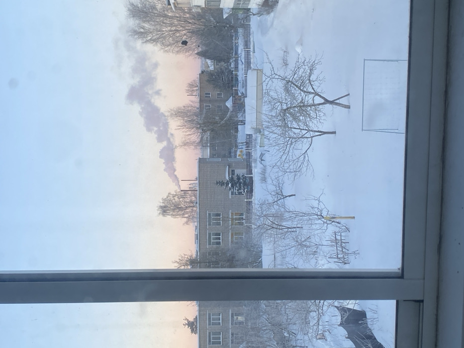 A winter scene viewed through a window shows a snow-covered courtyard with bare trees and a soccer goal. Buildings stand in the background, one with smoke rising from a chimney. The sky is a pale mix of blue and pink, suggesting dawn or dusk. The window frame partially obscures the view.
