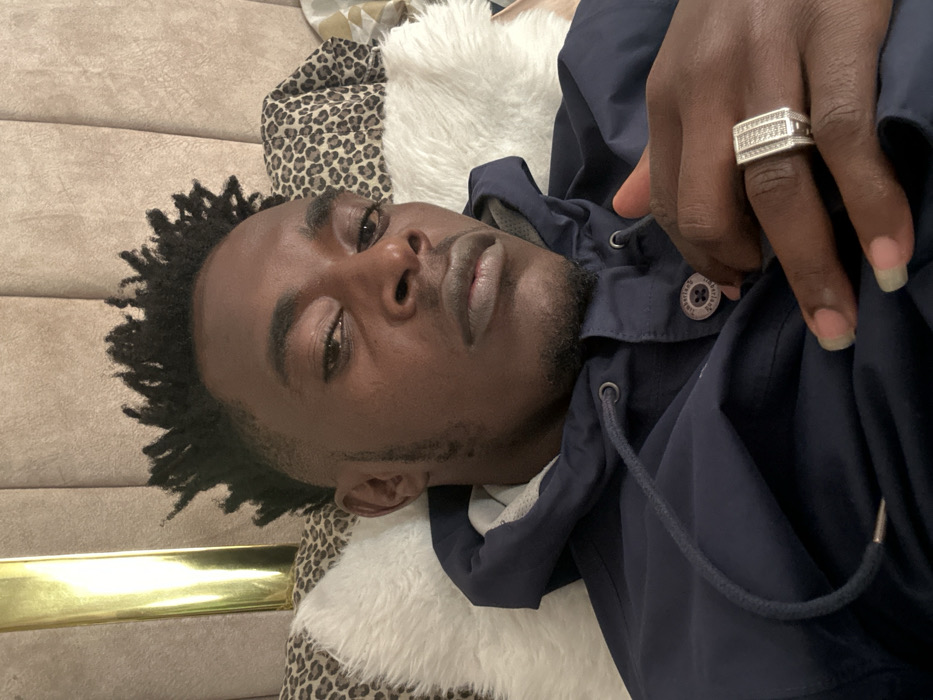 The image captures an adult male in a close-up, head-and-shoulders portrait, reclining in an indoor, domestic setting. The subject, with dark skin, exhibits short, dark, textured hair styled with a fade and small dreadlocks or twists. He has a thin beard and mustache. His dark eyes are directed at the camera, and his mouth is closed, maintaining a neutral expression. He wears a dark blue hooded jacket, identified by a visible button bearing what appears to be a "Timberland" logo. A light-colored lining is visible within the hood. His left hand is partially visible, resting on his chest, adorned with a prominent silver-toned ring featuring multiple rows of small, clear stones on the ring finger. His fingernails are visible and elongated. The background consists of a light brown, padded headboard or wall paneling with vertical sections. A vertical golden metallic strip is visible on the left side of the frame. Two pillows are present: one white and fluffy, supporting the subject, and another with a leopard print pattern, positioned behind the first. The specific location within Nairobi, Kenya, cannot be determined from the visual information provided.