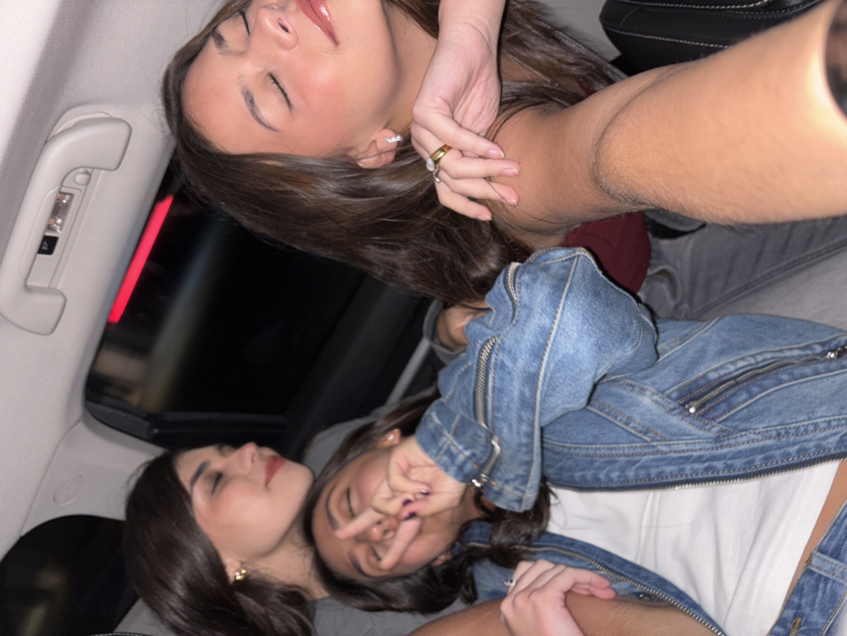 The image depicts three young women inside the rear passenger compartment of a vehicle, in what is assumed to be Mexico City, Mexico, during nighttime hours. The vehicle's interior is visible, featuring a light-colored headliner and a grab handle equipped with an integrated light fixture. A blurred red light streak is visible through the window against a dark exterior. On the right side of the frame, a woman with dark brown hair, fair skin, and glossy lips is shown with her eyes closed, head tilted back, and a serene expression. She wears a small silver stud earring. A gold-colored ring is on the ring finger of her right hand, which rests on the shoulder area of the central figure. Her forearm, covered in fine light hair, is prominent in the foreground. She is dressed in a dark red garment. In the center, a second woman with dark brown hair is visible, making a "peace" sign with her right hand, which has dark-colored nail polish. Her eyes are also closed, suggesting a playful or joyful disposition. She wears a blue denim jacket featuring multiple decorative zippers on the sleeves and front, over a white top. On the left side of the frame, a third woman with dark brown hair and a small gold hoop earring is partially visible. She looks towards the right with a subtle smile and wears a grey top. Her right arm is placed around the shoulder of the central woman. All three women are in close proximity, indicating a casual and interactive scene.