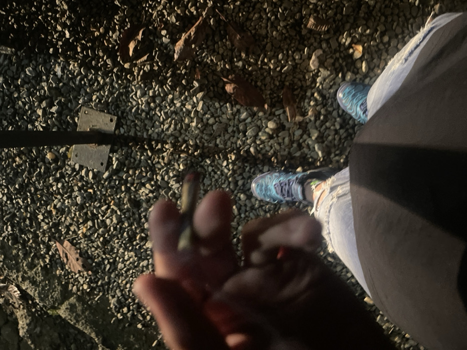 A person stands on small gravel, holding a lit cigarette. Light-wash, ripped jeans and blue running shoes are visible. A black item of clothing is also present. Some dry leaves are scattered on the gravel. A metal post with attached brackets is on the left side of the image.