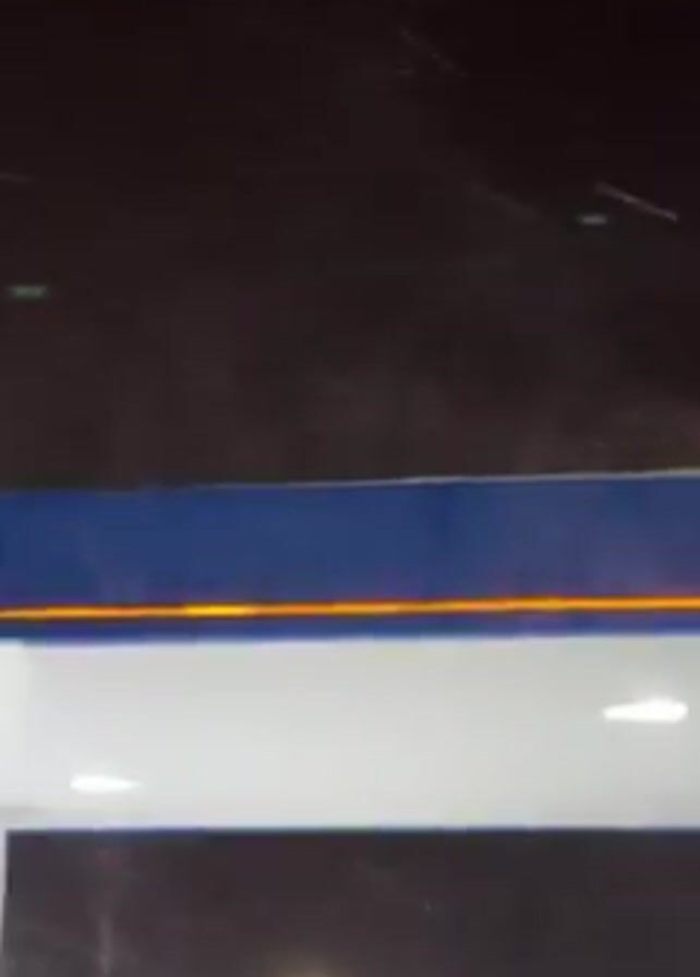 white wind turbine spinning atop a gas station canopy on a snowy night