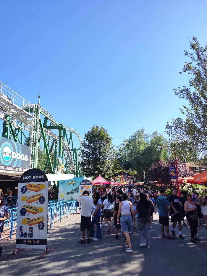 A bustling amusement park scene under a clear blue sky. Crowds of people stroll along a walkway lined with food vendors and attractions. A green roller coaster looms in the background, its tracks twisting and turning. A "Hot Dogs" sign advertises the park's food options. The atmosphere is lively, with a mix of families and individuals enjoying the day's festivities. Trees and greenery provide shade and add to the park's ambiance.