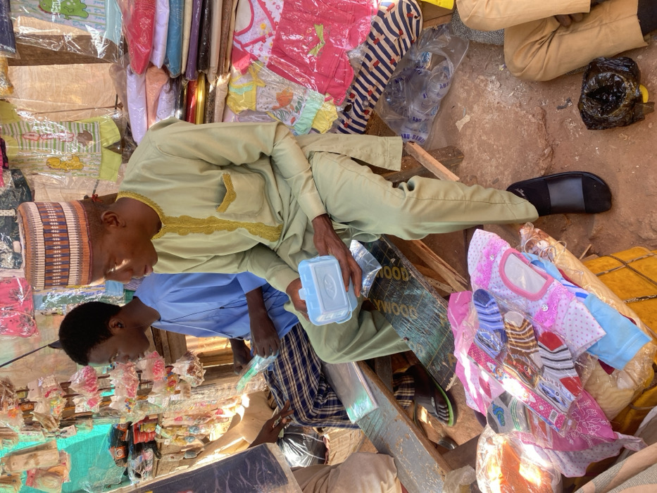 The scene depicts a market stall in Sabon Gari South, Nigeria, with two adult males seated on makeshift wooden benches