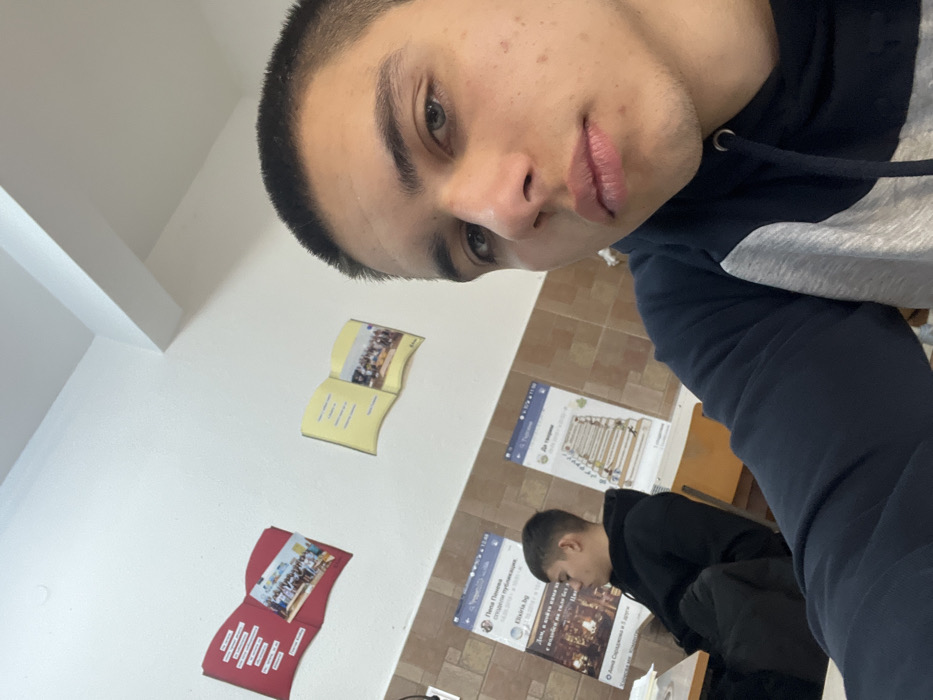 An eye-level selfie-style photograph captures an indoor classroom scene within Primary School 'St. Cyril and Methodius' in Panagyurishte, Bulgaria. The primary subject, a young male with short dark hair and light eyes, occupies the right side of the frame, looking directly at the camera with a neutral expression. He wears a dark blue and light grey hooded sweatshirt. To his left and in the background, a second young male with dark hair is seated at a wooden desk, facing away from the camera and looking downwards. He wears a dark-colored hoodie. The classroom features a two-toned wall structure: the upper section is plain white, while the lower section is brown, appearing to be wood-paneled or tiled. Two decorative open book-shaped posters, one red and one yellow, are affixed to the white wall, each displaying text and an image of a group of people. Below these, on the brown wall section, two large vertical posters designed to resemble Facebook posts are displayed. The left poster contains Bulgarian text, including "Pena Penova" and "Elixiria.bg", and features an image of an interior space. The right poster, titled "Да творим" (To create), depicts a stack of books forming steps and clearly indicates "ОУ Св. Св. Кирил и Методий - Панагюрище" (Primary School 'St. Cyril and Methodius' - Panagyurishte), confirming the location. Wooden desks and chairs are visible, consistent with an educational environment. The room is uniformly lit.