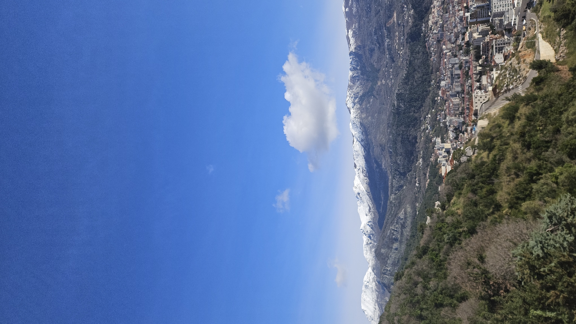 The image displays a vertical panoramic view from an elevated position overlooking the city of Budva, Montenegro, extending towards a mountain range under a clear blue sky. The upper half of the frame is dominated by a vibrant blue sky with sparse, white cumulus clouds; one prominent cloud mass is situated centrally in the upper mid-frame. A range of mountains, primarily covered with white snow on their upper slopes, forms the horizon line across the mid-ground. Their lower slopes appear rugged and dark with sparse vegetation. In the foreground, a steep hillside covered in dense, mixed evergreen and deciduous trees and shrubs descends towards the urban area. The city of Budva occupies the lower-middle and lower-right portions of the frame, characterized by a dense cluster of multi-story buildings with light-colored facades and predominantly red-tiled roofs. A winding paved road is visible traversing the urban landscape and along the base of the vegetated hill. The scene is illuminated by bright daylight. No discernible individuals, specific actions, or close-up objects are present.