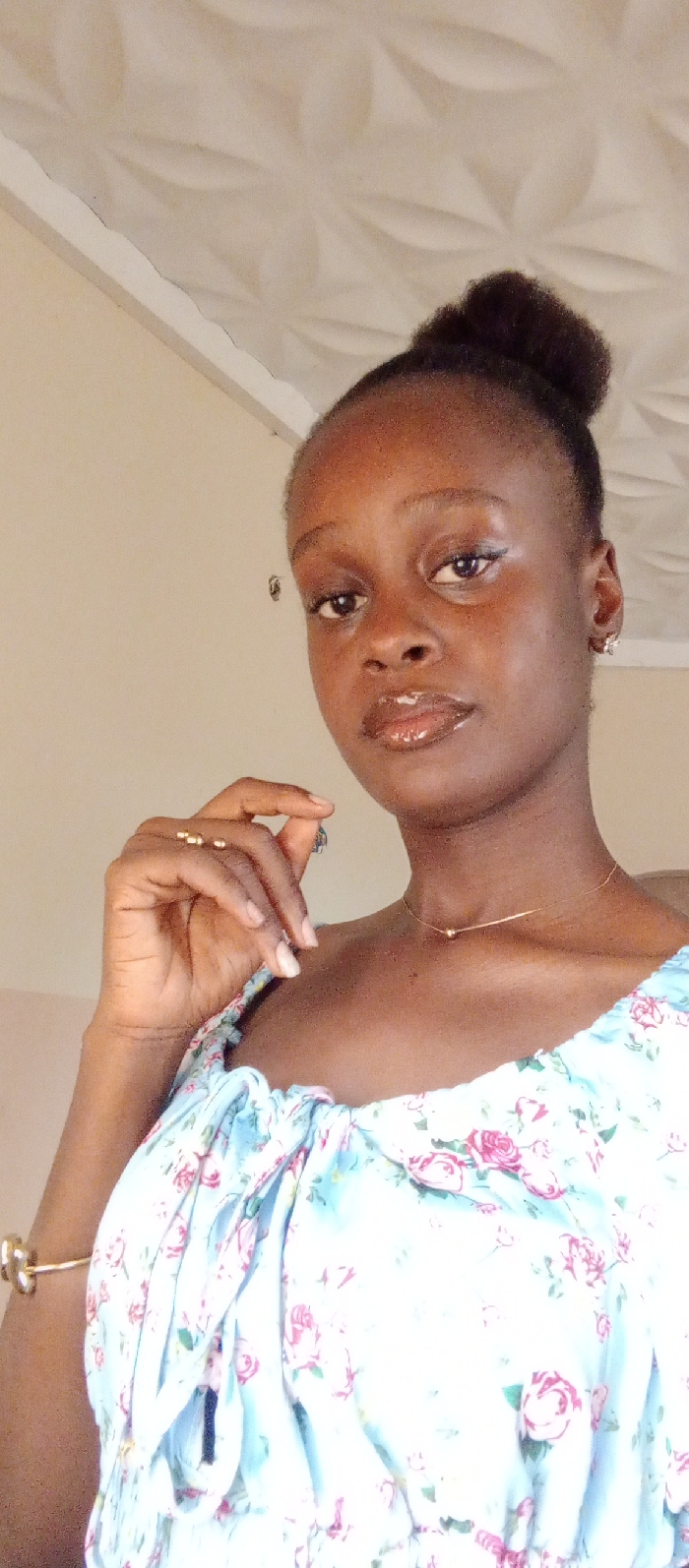 A dark-skinned woman with a bun hairstyle poses for a selfie. She wears a light blue, floral-print top and various gold accessories, including a bracelet, a necklace, and rings. Her makeup features glossy lips and visible eyeliner. The background includes a plain wall and a decorative ceiling.