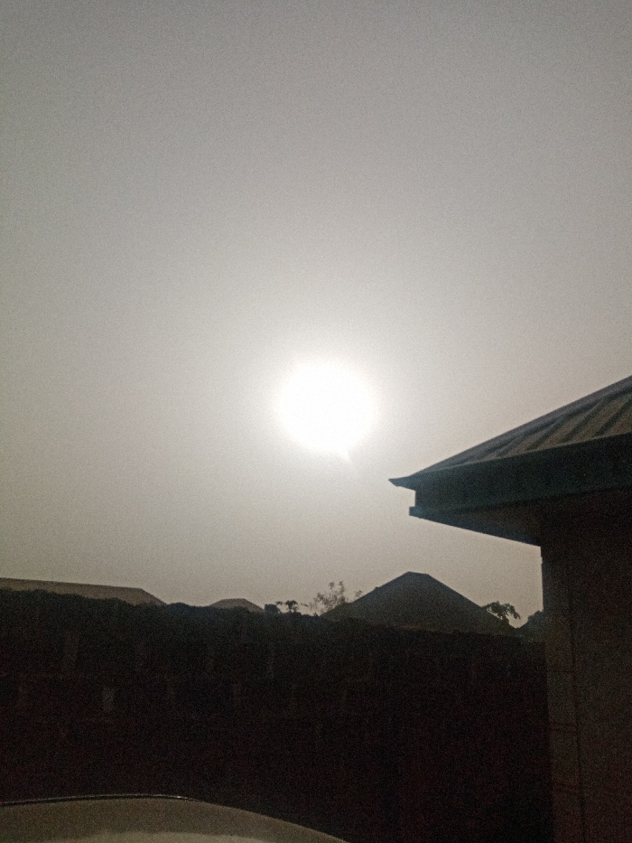 The image displays an exterior scene in Rido, Nigeria, under a hazy sky during daytime. A prominent, diffused bright light source, consistent with the sun, is centered in the upper frame through atmospheric haze. In the lower left foreground, a portion of a light-colored vehicle roof or hood is visible. A dark, horizontal structure, appearing as a wall or fence, spans the lower midground. Behind this structure, multiple dark-silhouetted building roofs and sparse tree outlines are discernible. A building with a dark, sloping roof and a section of its exterior wall is present in the right midground. No individuals, specific actions, or direct interactions are visible.