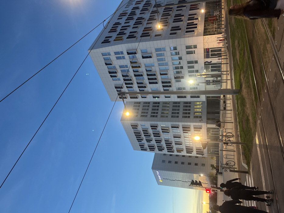 The image displays a modern urban scene at dusk in the Euroméditerranée district of Marseille, France, near the Golden Tulip Marseille Euromed hotel. The sky exhibits a gradient from deep blue overhead to an orange-yellow hue on the western horizon, traversed by multiple overhead electrical wires. Three multi-story, contemporary buildings form the background. The leftmost structure, identified as the "GOLDEN TULIP" hotel by prominent signage, is light-colored with numerous rectangular windows. To its right are two similar, white or light-grey modern buildings, each featuring extensive, uniformly arranged windows, some with dark or colored internal panels. Street-level commercial spaces are visible on the rightmost building. In the mid-ground, tram tracks run diagonally across the lower portion of the frame. A pedestrian crossing with white zebra stripes is visible on the left, perpendicular to the tracks. A grassy median separates the tram tracks from the sidewalk. Numerous streetlights emit warm yellow light, illuminating the scene. Bollards delineate the pedestrian areas, and two bicycles are secured at a rack on the sidewalk. A red traffic light is visible on the left, indicating a red signal. A red fire hydrant is on the right sidewalk. Four individuals are distinctly visible. On the far-right foreground, a female with light brown hair is partially visible, facing left. In the mid-ground left, three individuals are on the pedestrian crossing: one person on roller skates is central to this group, flanked by two walking individuals, all wearing dark clothing. Additional, indistinct figures are discernible on the sidewalks near the building entrances.