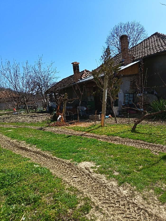 The image depicts a rural scene in Draganovo, Bulgaria, under a clear blue sky. In the foreground, patches of vibrant green grass are interspersed with bare soil featuring distinct vehicle tire tracks running diagonally from the lower left to the upper right. The midground contains several deciduous trees with bare branches, indicative of late winter or early spring, along with various unidentifiable objects and posts. The background is dominated by a single-story residential building with an aged, reddish-brown tiled roof. Two brick chimneys, each topped with a clay pot, rise from the roofline. The house exterior exhibits sections of faded plaster, exposed brick, and a small wooden extension or overhang below the eaves. No individuals or active subjects are visible within the frame.