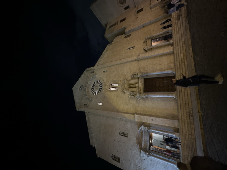 The image displays the illuminated exterior of the Basilica di San Nicola in Bari, Italy, captured at night from a low-angle perspective. The basilica's prominent light-colored stone facade features a large, ornate circular rose window in the upper center. Below the rose window, a central portal with a closed, dark wooden double door is visible, surmounted by a niche containing a statue flanked by two smaller statues. To the viewer's left, a grand open portal reveals an illuminated interior, with multiple indistinct figures appearing to enter or exit. To the viewer's right, a smaller entrance is visible, with several individuals standing on the steps in front of it. A wide set of stone steps leads up to the basilica's entrances. In the immediate foreground, a single individual, blurred by motion, walks leftward across a dark cobblestone surface, appearing to hold a mobile device. The sky above the basilica is dark, with subtle cloud formations visible. The overall scene is lit by artificial light sources, highlighting the architectural details of the building against the dark night.