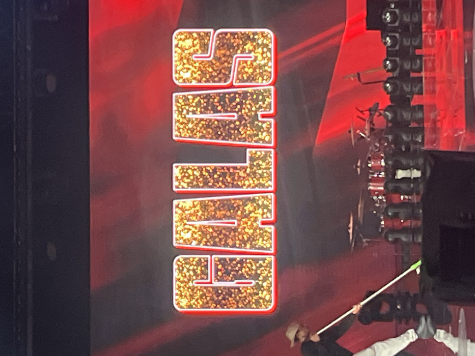 The image displays the word "CULTO" vertically stacked with each letter outlined in red and filled with a gold speckled pattern. A drum set and stage lights are visible on the right side, along with a stagehand holding a mop, possibly cleaning the floor. A red background subtly illuminates the scene.