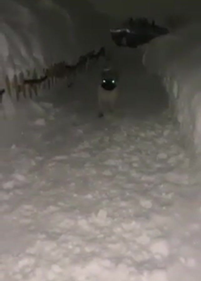 A low-angle video shows a pug dog walking toward the camera through a snow-covered path. The path is bordered by high snowbanks and a wooden fence on the left side. The video is taken at night, with the pug's eyes reflecting light. The pug gets very close to the camera at the end of the video, nearly filling the frame.