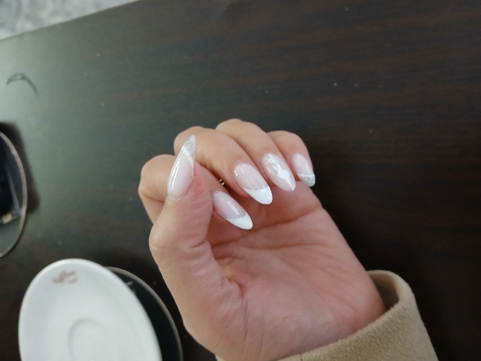 A hand displays pointed nails with white and silver designs. The nail on the index finger has a curved white stripe with a silver border. The middle finger features a cloudy white pattern, and the ring finger has a similar stripe to the index finger. The pinky nail is tipped with silver. A white saucer and dark surface are visible in the background.
