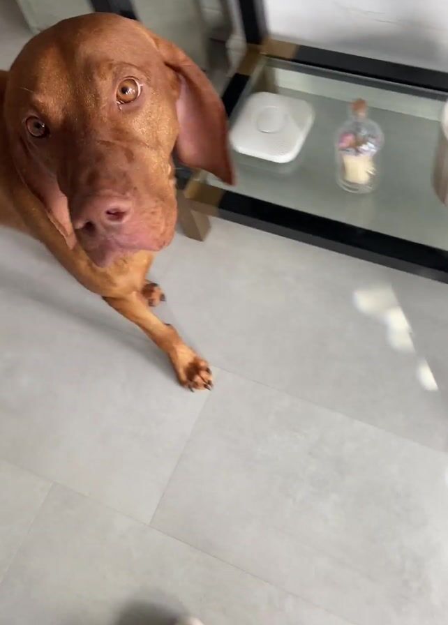 - "A dog, possibly a Vizsla, stands on a light-colored tile floor near a multi-tiered glass and black metal table" by FM-PeREE2, licensed under CC BY 4.0