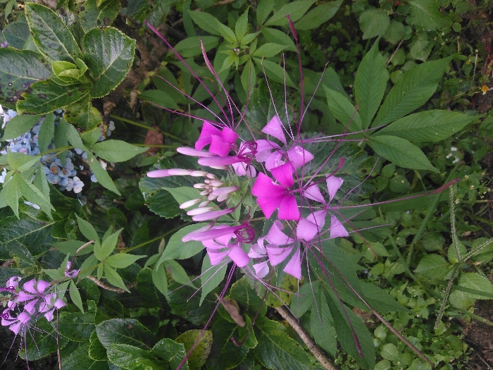 The image displays a close-up, top-down view of vibrant botanical foliage and flowers, situated in Ciloto, Indonesia. The central focus is a cluster of blooming spider flowers (Cleome hassleriana), exhibiting petals in shades of fuchsia and lavender-pink, with distinctively long, thin, radiating stamens and pistils of a darker purple hue. Several developing flower buds are visible at the cluster's core. A second, smaller cluster of similar lavender-pink spider flowers appears in the upper-left quadrant. The background consists of dense green foliage, featuring various leaf shapes and sizes. Within the upper-right quadrant of the background, clusters of small, light blue flowers, consistent with Hydrangeas, are partially visible amongst the green leaves. No human figures, animals, or artificial objects are present. The scene is illuminated by natural, soft light, indicative of an outdoor, vegetated environment.