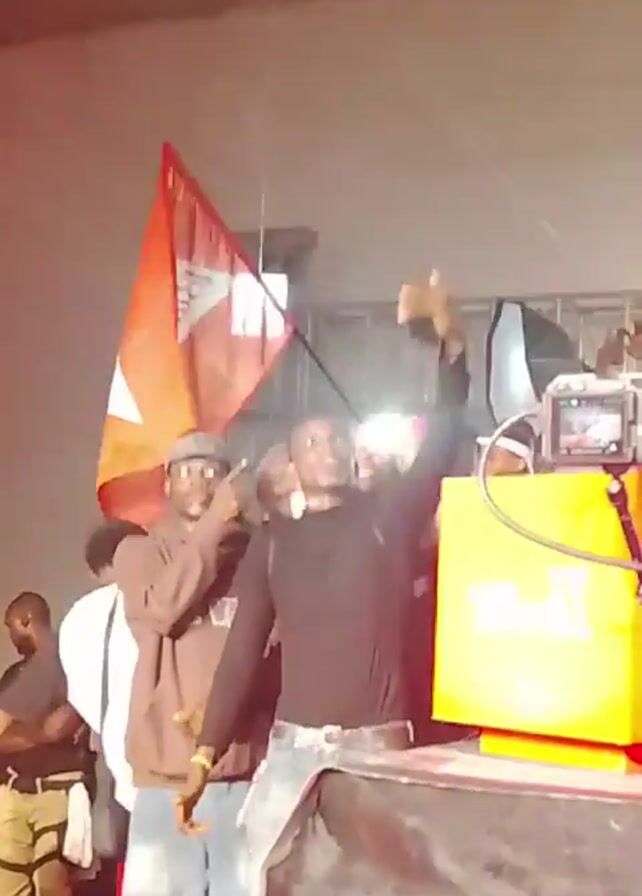 group of people on a stage in what appears to be a concert setting. The stage is lit with bright lights and there's a camera positioned to record the scene. The central figure on the stage is holding up a red flag. Several other individuals stand around him, some of them with their hands raised in the air, appearing to be enjoying the event. The flag the man is holding has a symbol or design on it. Behind the group, there is a yellow box with "Bud X" written on it. The setting seems lively with music playing in the background.