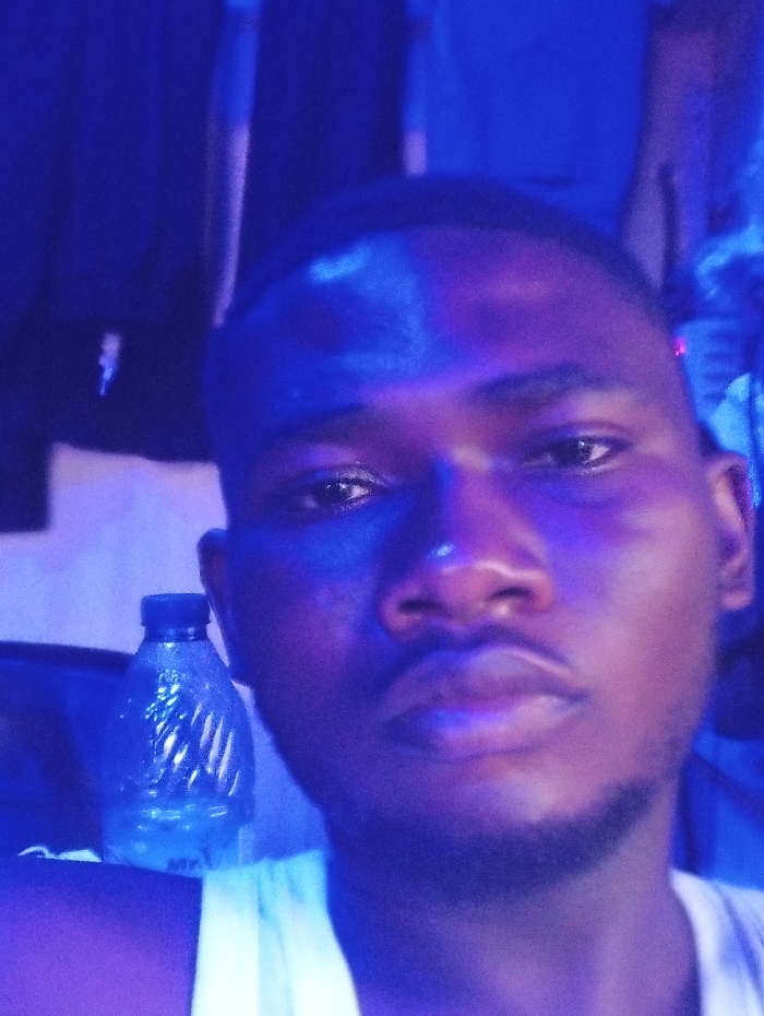 A close-up, chest-up image shows a male individual with dark skin, short hair, and a light beard, looking directly at the camera with a neutral expression. He is wearing a light-colored tank top. The scene is characterized by a strong blue and purple ambient light, suggesting an indoor setting. A clear plastic water bottle with a blue cap is visible in the background to the left. The location is Samaru, Nigeria.
