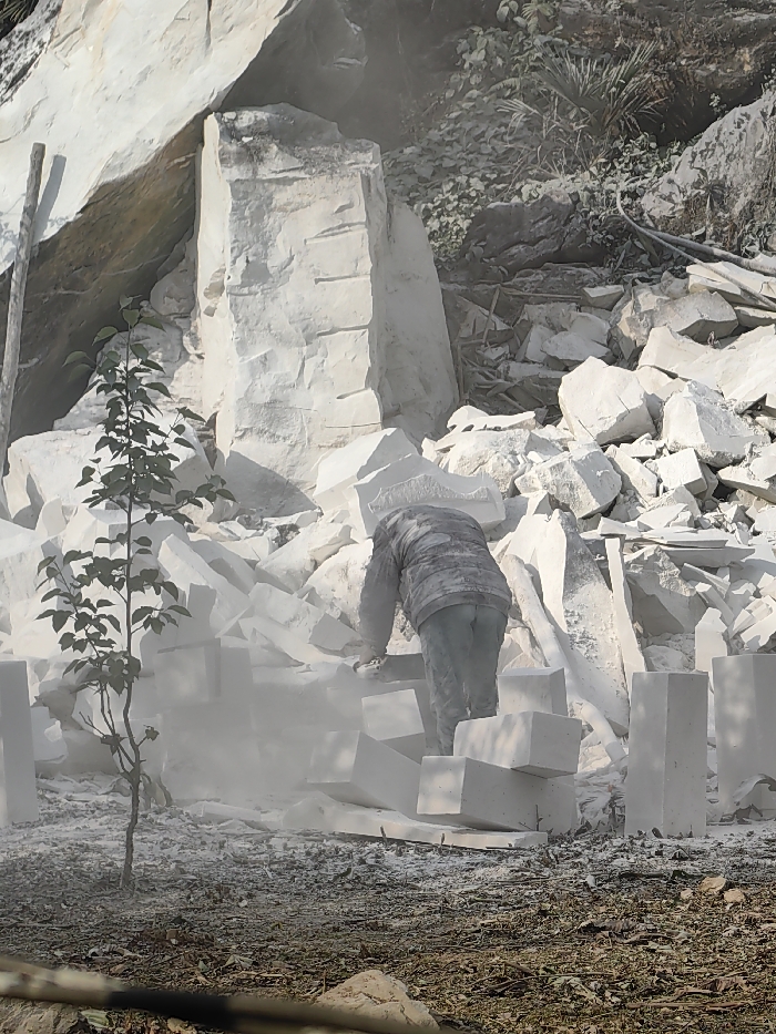 This image captures an outdoor stone working scene in Tả Van, Vietnam, under daylight conditions