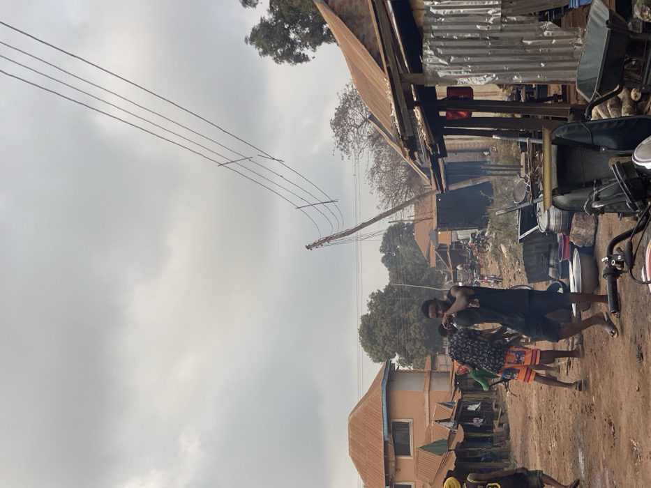 An overcast day in what appears to be a town or village. Multiple power lines stretch overhead, connected to a leaning utility pole. Several buildings, varying in height and construction, line the scene. A group of people are standing on a dirt ground, one shirtless, near what seems to be a motorcycle. In the background, other buildings and trees fill the horizon.