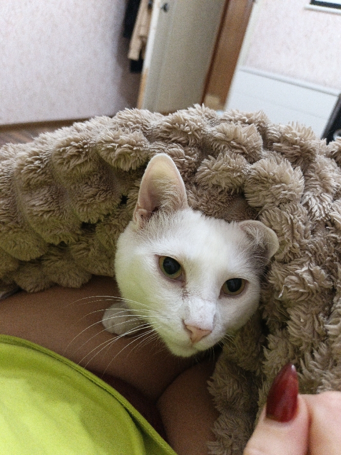 - "A white cat peeks out from a tan, textured blanket, its head centered in the frame" by FM-YVp303, licensed under CC BY 4.0