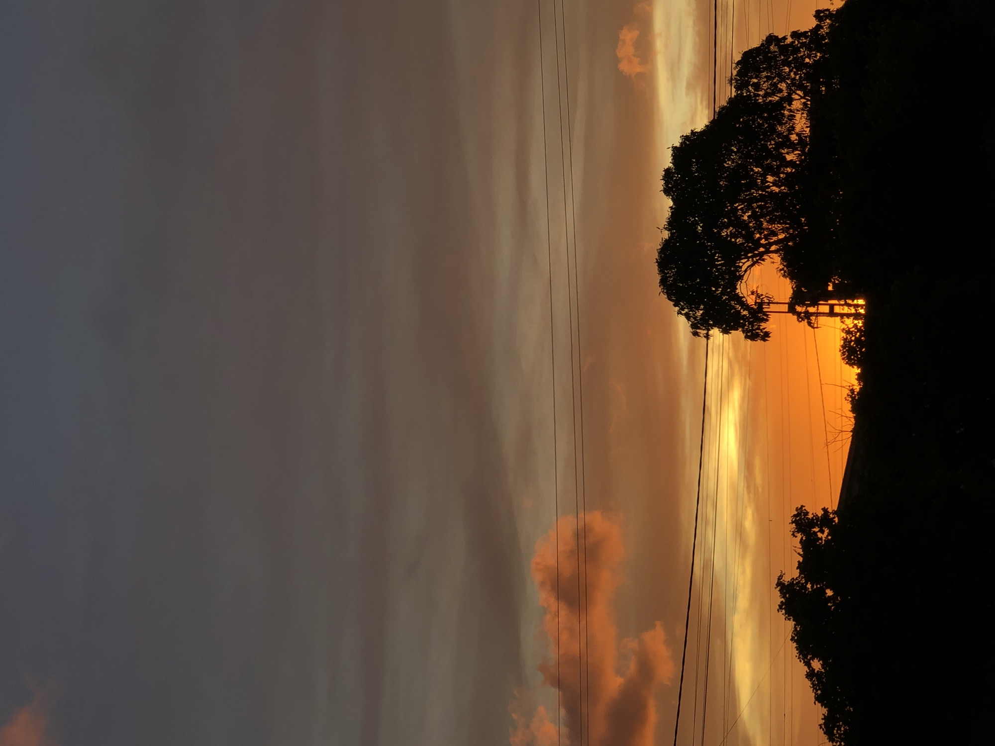 The image captures a sunset scene in the city of Altagracia, Venezuela. The sky exhibits a gradient, transitioning from a dark gray-blue at the top to vibrant orange and yellow hues at the horizon. Scattered clouds, some appearing as distinct orange-pink formations, are visible against the illuminated sky. Multiple horizontal power lines traverse the middle ground of the frame. The lower portion of the scene is dominated by dense, dark silhouettes of trees and vegetation, completely back-lit by the setting sun. A large tree with a dense canopy is prominently silhouetted on the right side, partially obscuring a utility pole. The foreground consists of an undifferentiated mass of dark vegetation or ground cover. No individuals, animals, or active subjects are present.