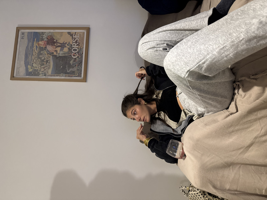 A woman with dark hair sits cross-legged on a tan bed. She wears gray sweatpants, a black top, and a gray and yellow patterned shirt. She pulls at a strand of her hair while looking at something out of frame. A wine glass sits beside her on the bed. On the wall behind her is a framed picture with the word "Corse" visible. The wall is a pale shade of cream. A blue pillow is partially visible in the upper right corner.