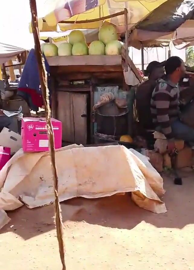 busy outdoor market in the daytime. There are many vendors selling goods under makeshift shelters with colorful umbrellas. People are milling around, presumably shopping or socializing. Goods are visible, including green coconuts, boxes of Milo, and various other items. Some individuals are seated, while others are walking. The ground appears to be dirt or sand. The overall atmosphere suggests a vibrant, bustling marketplace.