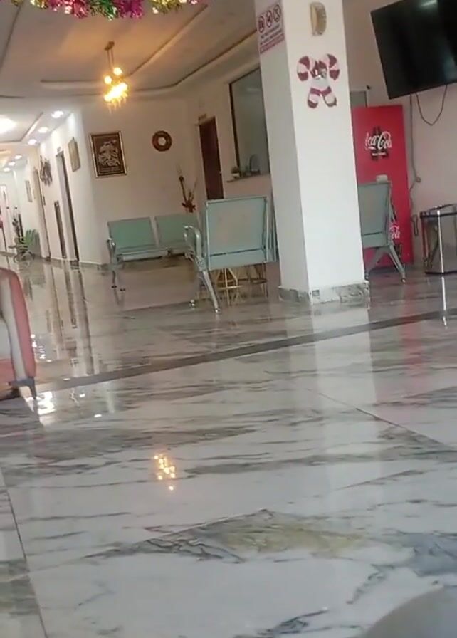 The camera rests on a marble floor with grey and white patterns, reflecting the overhead lights. A grey fabric obscures the lower right corner of the frame. The scene is a waiting area, presumably in a hospital or clinic, decorated with tinsel and Christmas-themed decorations. In the background are two rows of light green metal chairs. A white support pillar is decorated with holiday stickers. A Coca-Cola cooler is visible behind the pillar. A TV screen hangs on the wall above. A hallway extends into the distance, with a man in a white coat and mask walking away from the camera. There is a chandelier in the distance as well. To the left, a pink and white couch is partially visible.